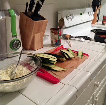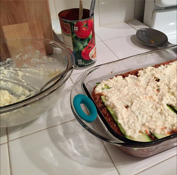 Slice the zucchini into as thin slices as you can. Line the baking dish with a thin layer of sauce (your choice – meat or otherwise). Make one layer of zucchini slices. Top the zucchini with the cheese mixture and then top with sauce. Repeat this until you have 2-3 layers of each.