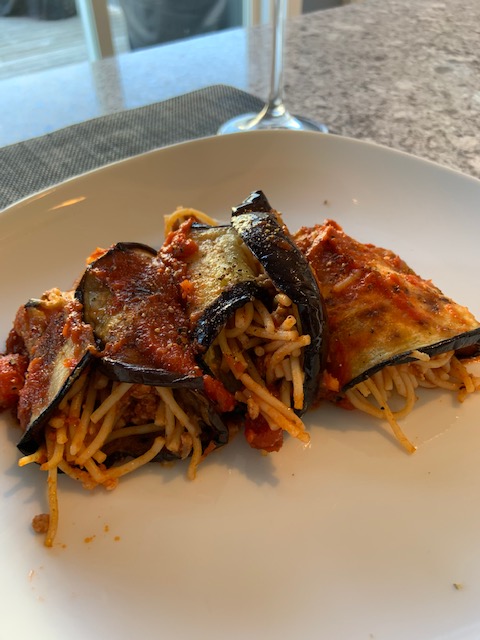 Line up slices and spoon about 1 tbsp (sloppily) of filling in the center of each slice. Roll each eggplant slice around the filling and place the roll into a baking dish. Once complete pour the tomato sauce (second cup) over the rolls. Top each roll with chili flakes and vegan sliced mozzarella (optional).