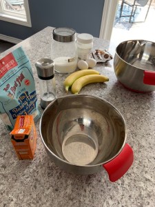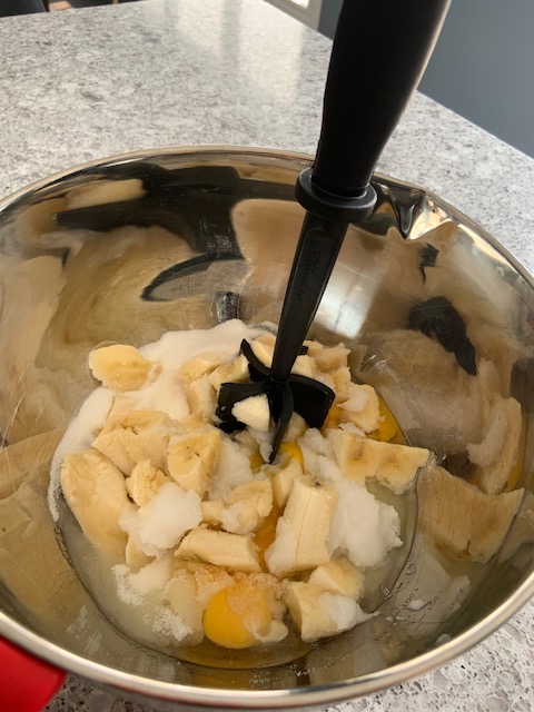 Preheat oven to 425F. If you are using a tin bread pan, spray with coconut oil cooking spray. If you are using a silicon bread pan, no need to spray.