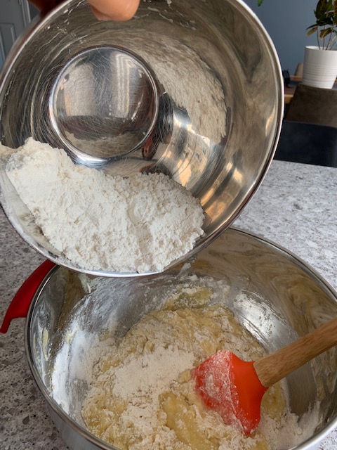 In a medium bowl, add the flour, salt and baking soda. Make sure to mix these ingredients until the salt and baking soda are spread throughout the mixture (some guess work here).