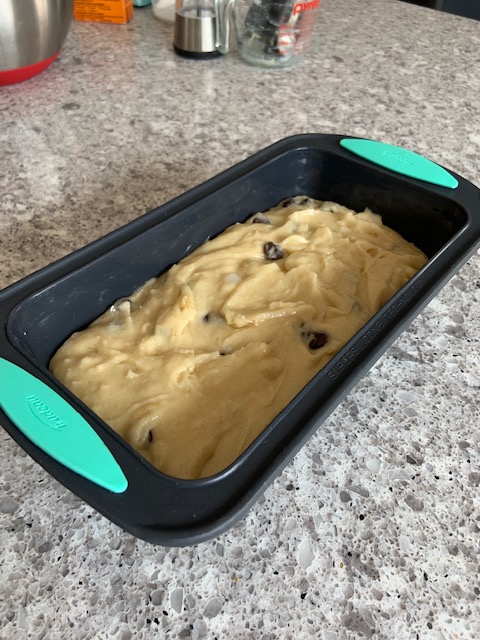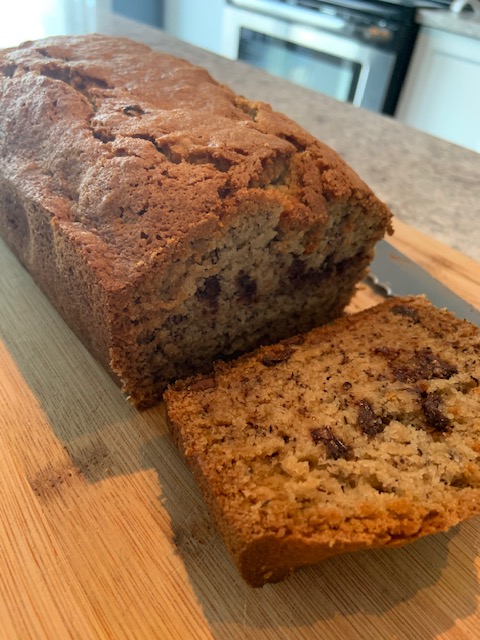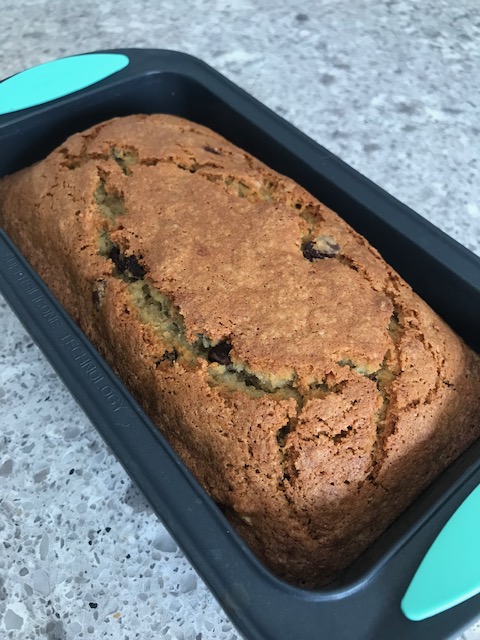 Pour the mixture into the bread pan. Place in the oven for about 10 min until the outside is nice and brown, then reduce the heat to 350 and cook for another 30-40 min. It is suggested to check the bread at 30 min with a toothpick. If still very wet, cook for the remaining 10 min. The inside will appear to be gooey at 40 min because of the banana and chocolate chips but it shouldn’t be wet.