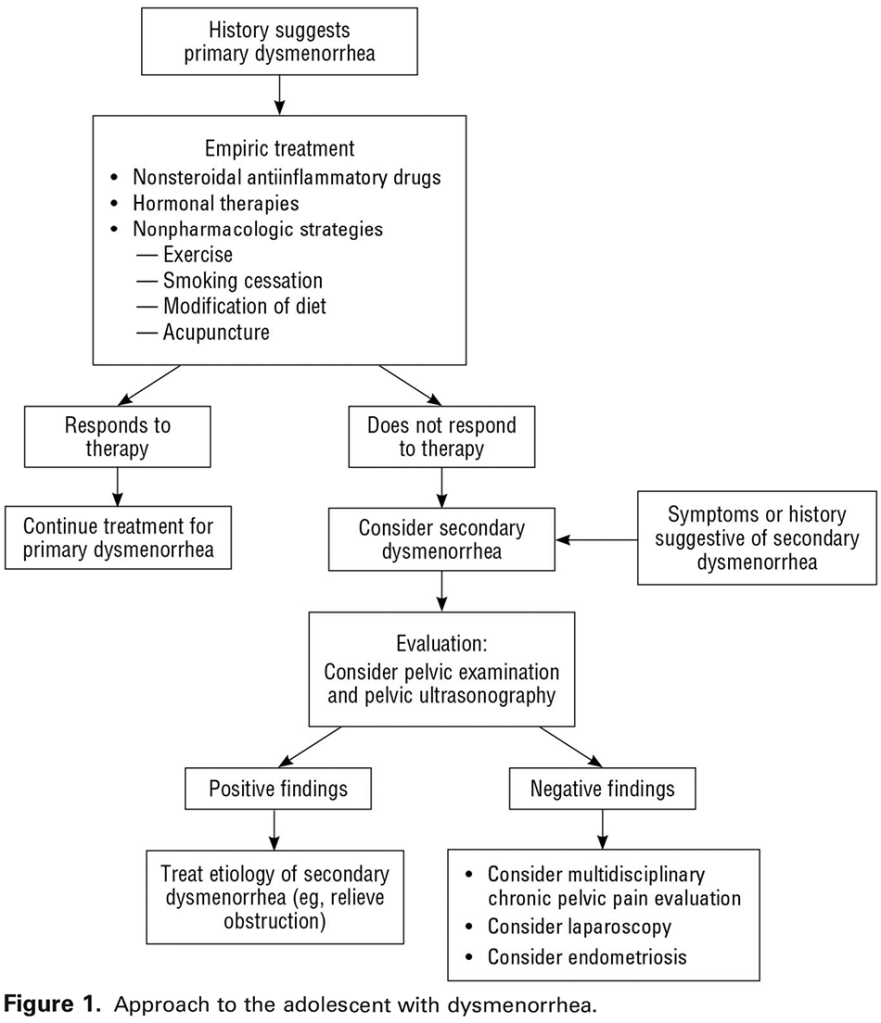 As we know from personal experience, if secondary dysmenorrhea is speculated, a hierarchy of tests are done to determine if the patient should have a laparoscopic procedure done to diagnose the patient and excise the endometrial tissue. The most common cause of secondary dysmenorrhea is endometriosis. Other causes of secondary dysmenorrhea include (in no order, adopted from ACOG):