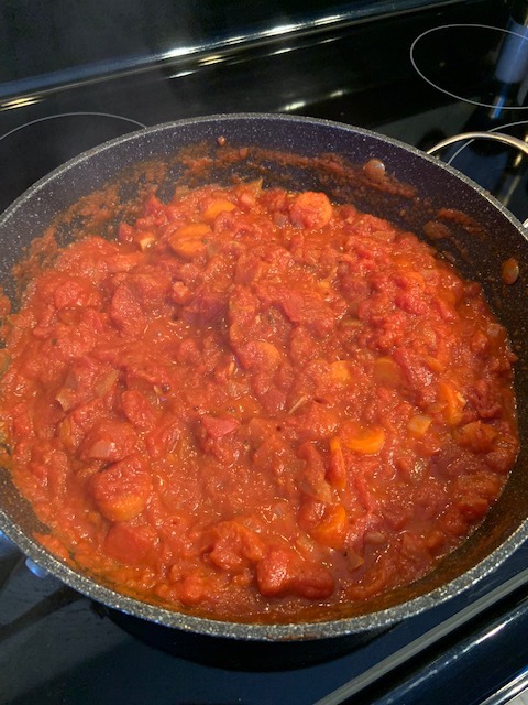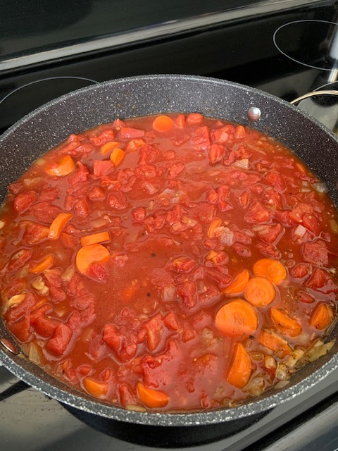 Add your tomatoes and broth, and cover for 5 min. The sauce will need to get very hot to help break down the tomato, so don’t worry if it starts to boil rapidly. Make sure to stir often or the tomatoes will clump at the bottom of the skillet.