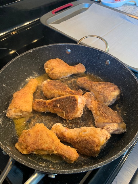 Arrange your set up so that the flour mixture is next to you – on the left – by the stove. Set a large frying pan on the stove. Place a baking sheet next to you – on the right – as well. Process will be to remove drumstick, drip off excess brine, coat in flour mixture, fry, and then place on baking sheet.